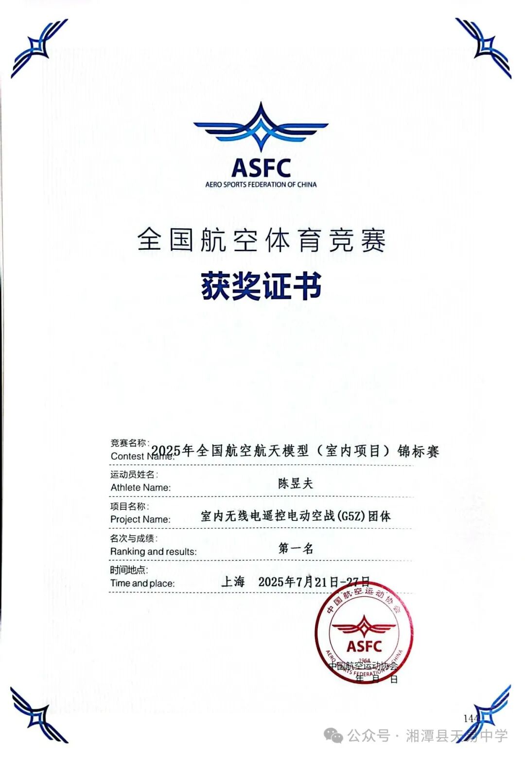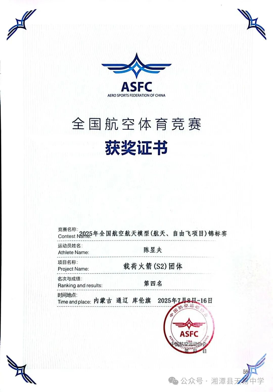 在2025年全国航空航天模型锦标赛中,陈昱夫同学表现突出,先后与队友合作,荣获室内无线电遥控电动空战(G52)团体项目冠军、载荷火箭(S2)团体项目第四名。一人独揽两项重要荣誉,体现了我校在航空航天科技教育方面的扎实基础。