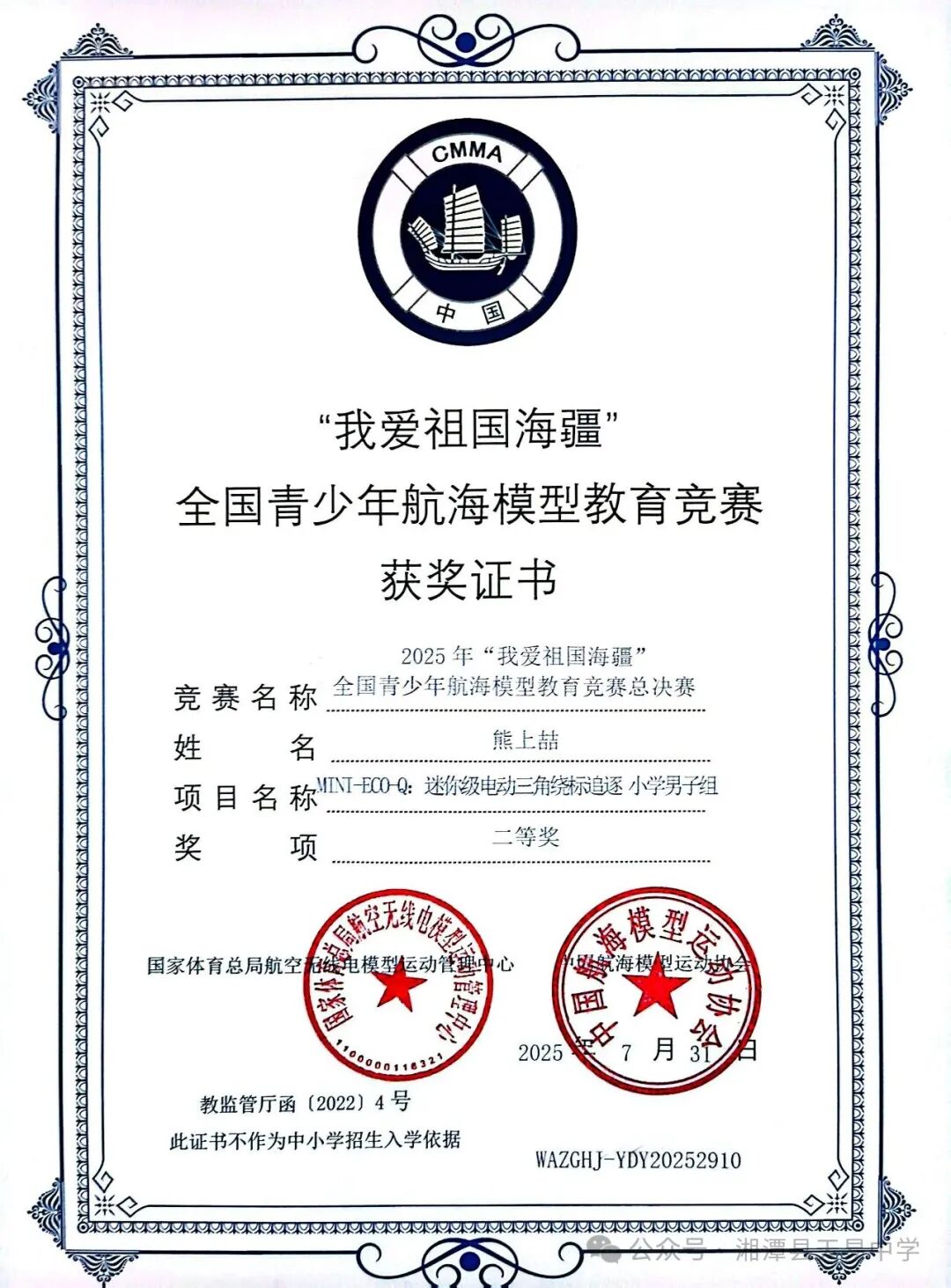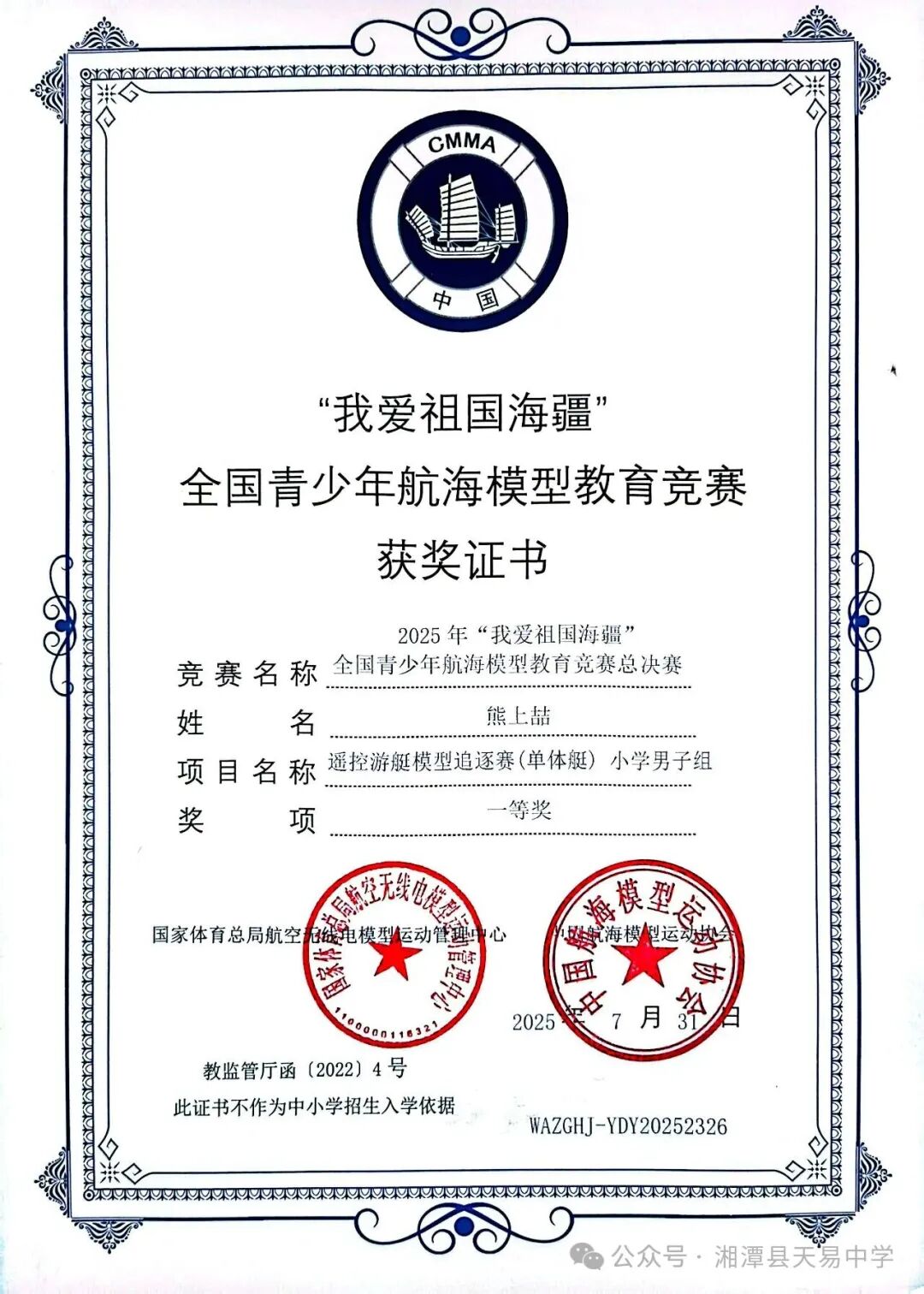 熊上喆同学在“我爱祖国海疆”全国青少年航海模型教育竞赛总决赛中表现优异,获得遥控游艇模型追逐赛(单体艇)小学男子组一等奖、迷你级电动三角绕标追逐赛小学男子组二等奖,展现出天易学子在航海科技领域的探索热情与实践能力。