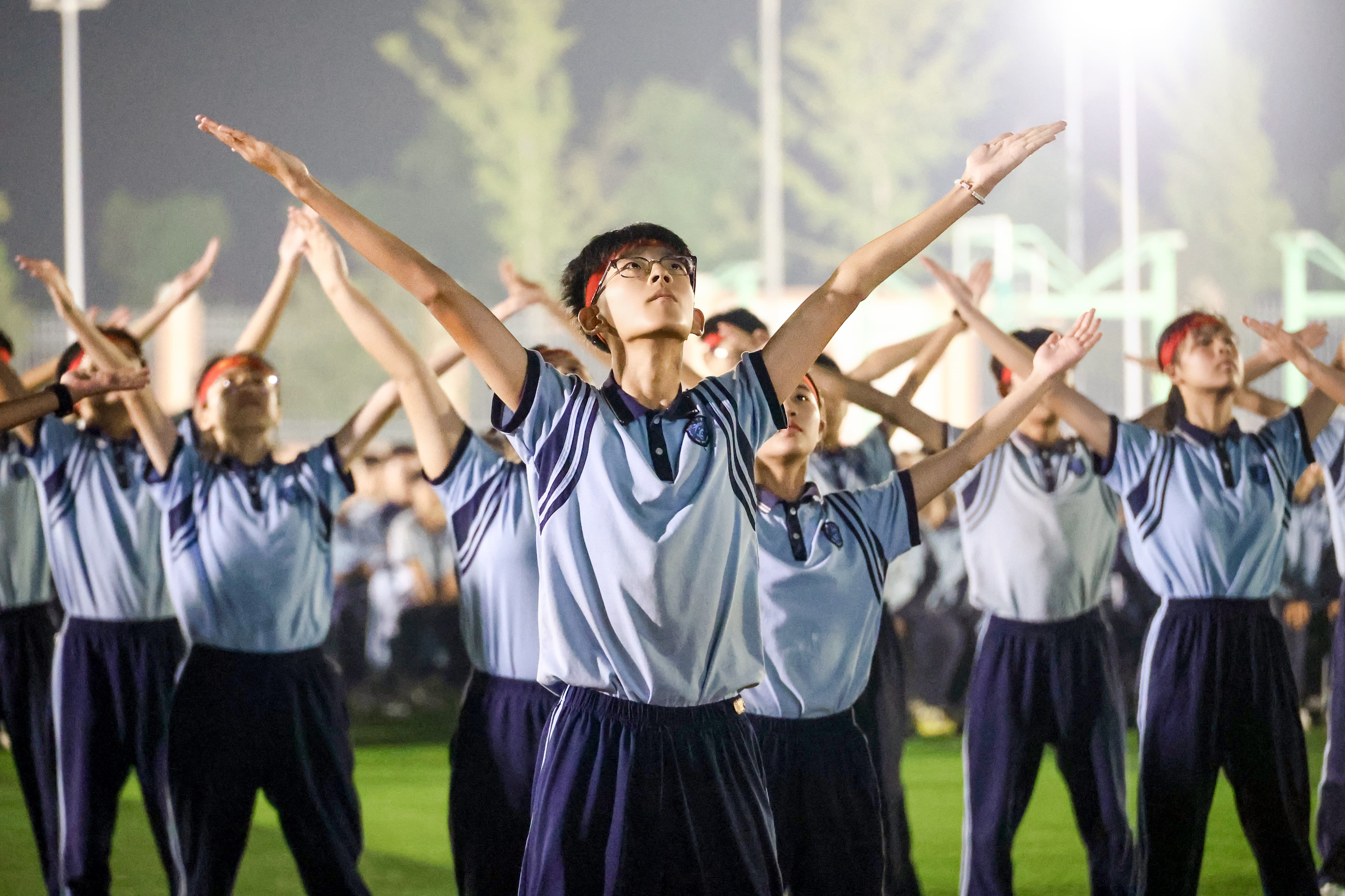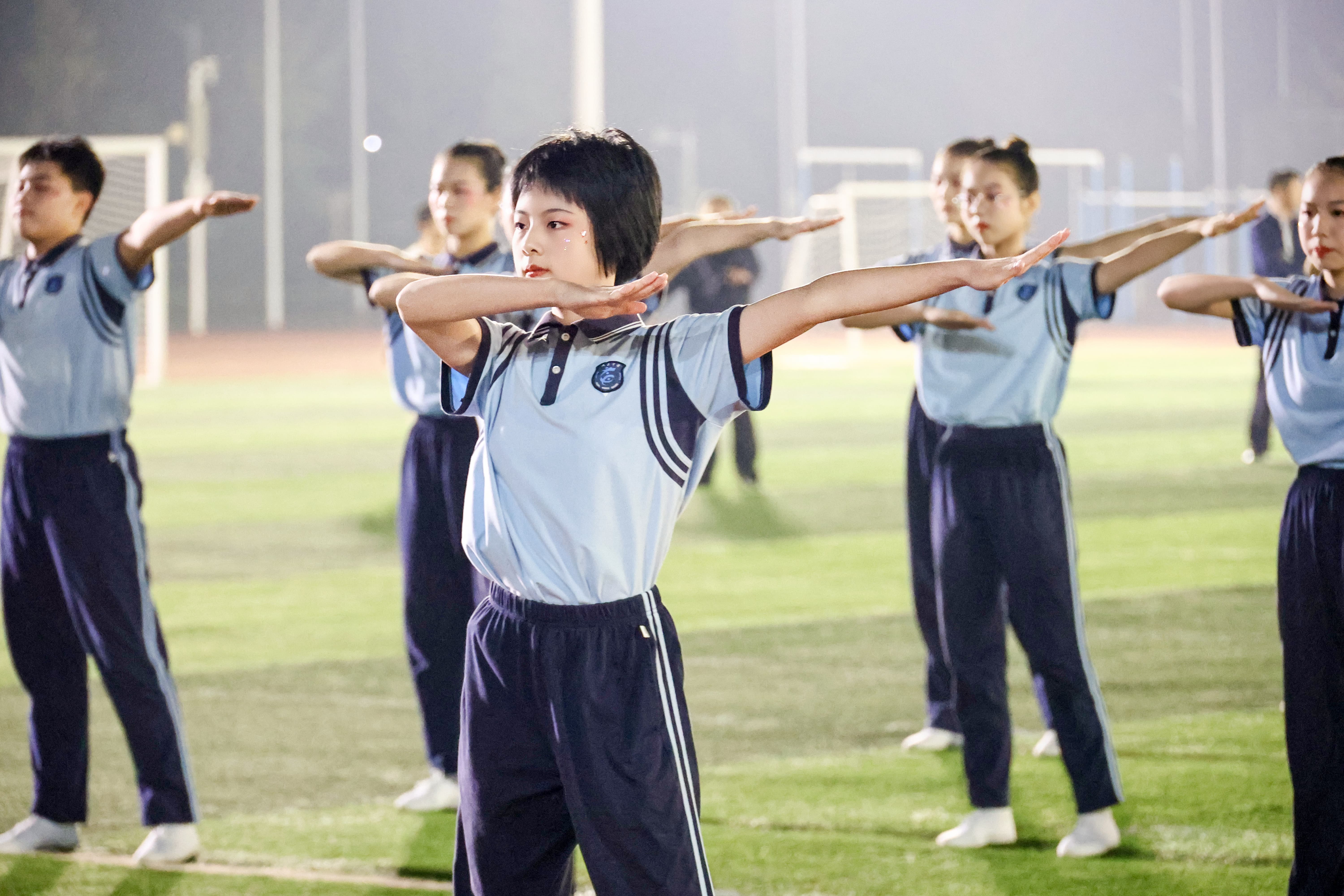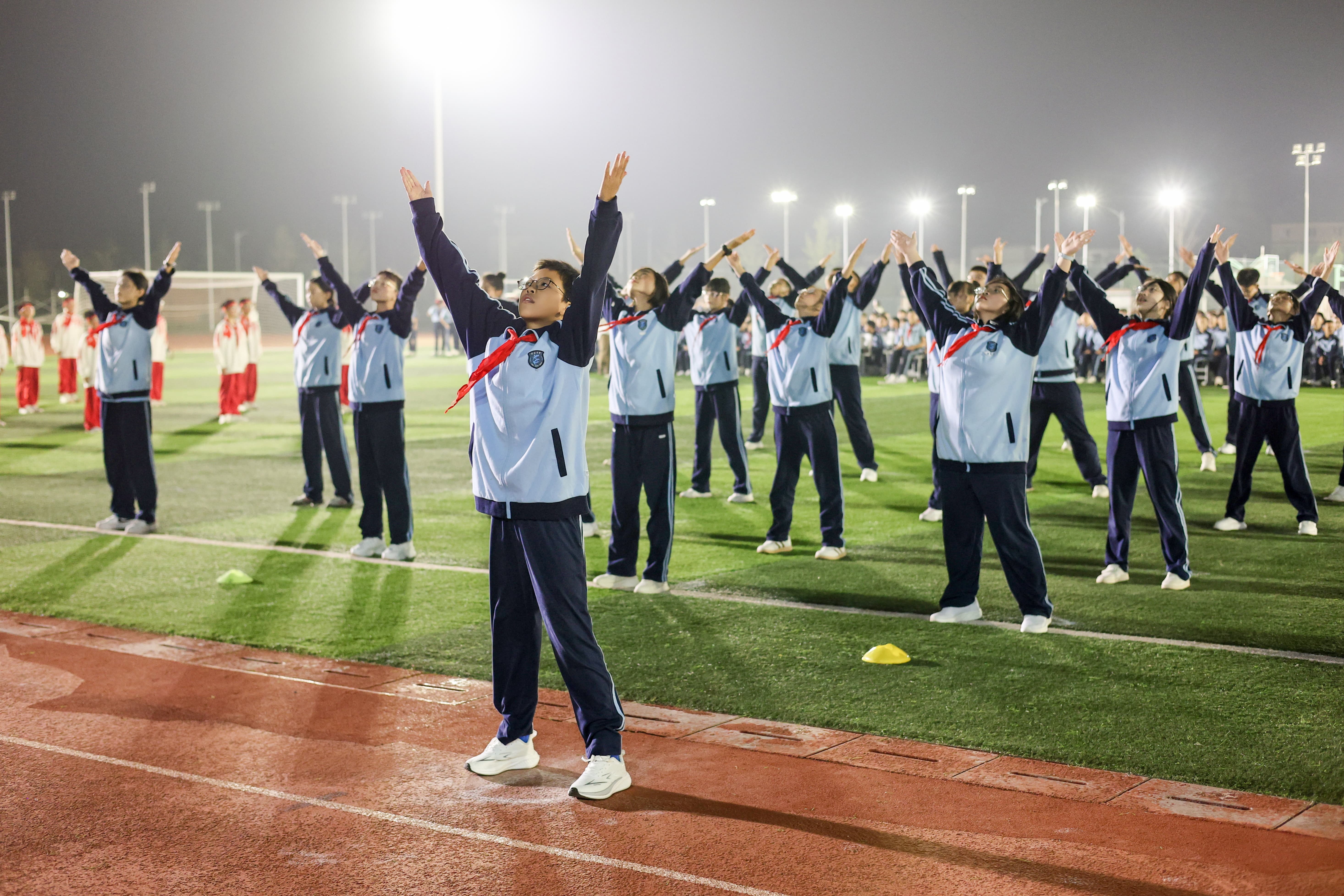 队列展示的余威尚在,广播体操的旋律随即响彻夜空。