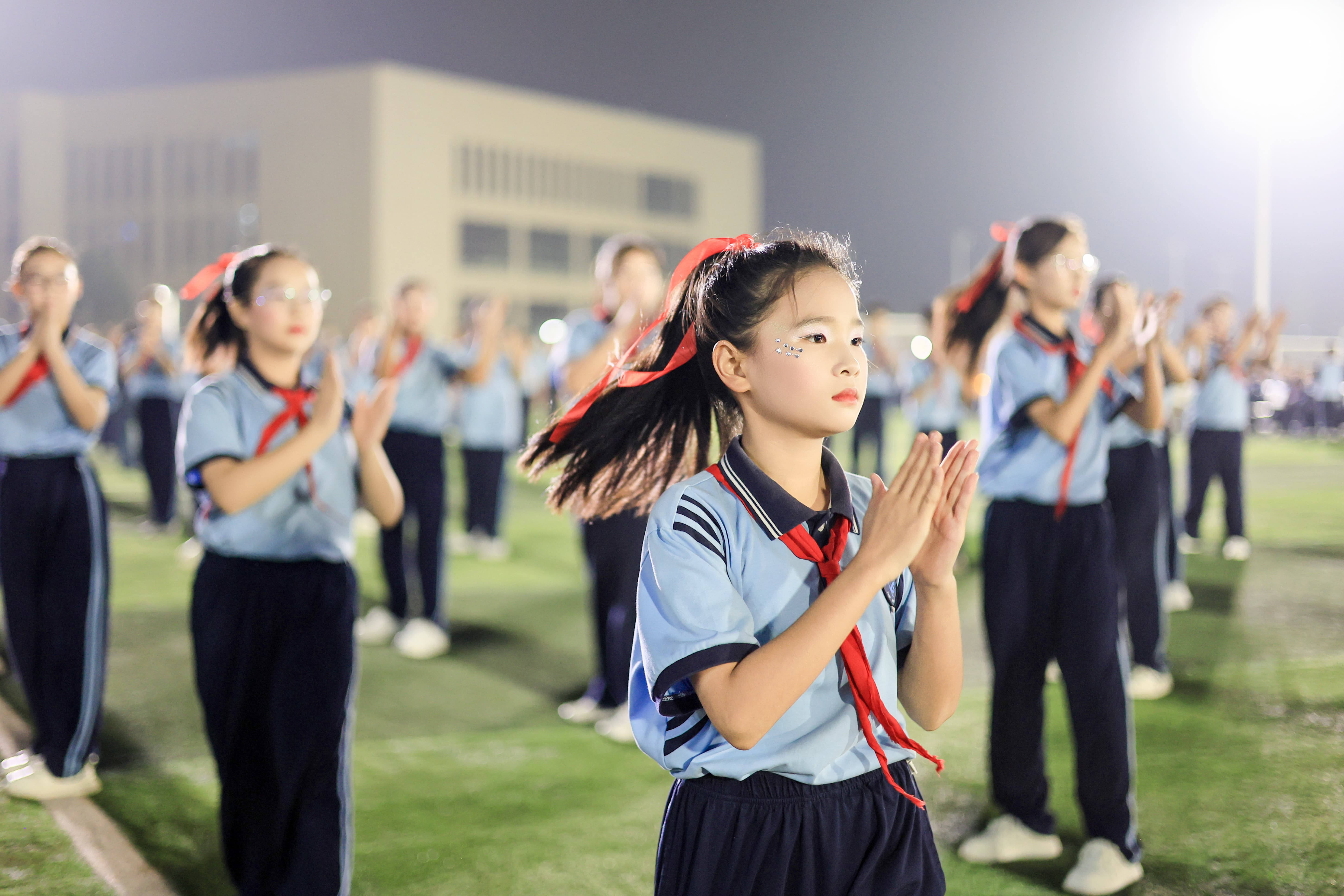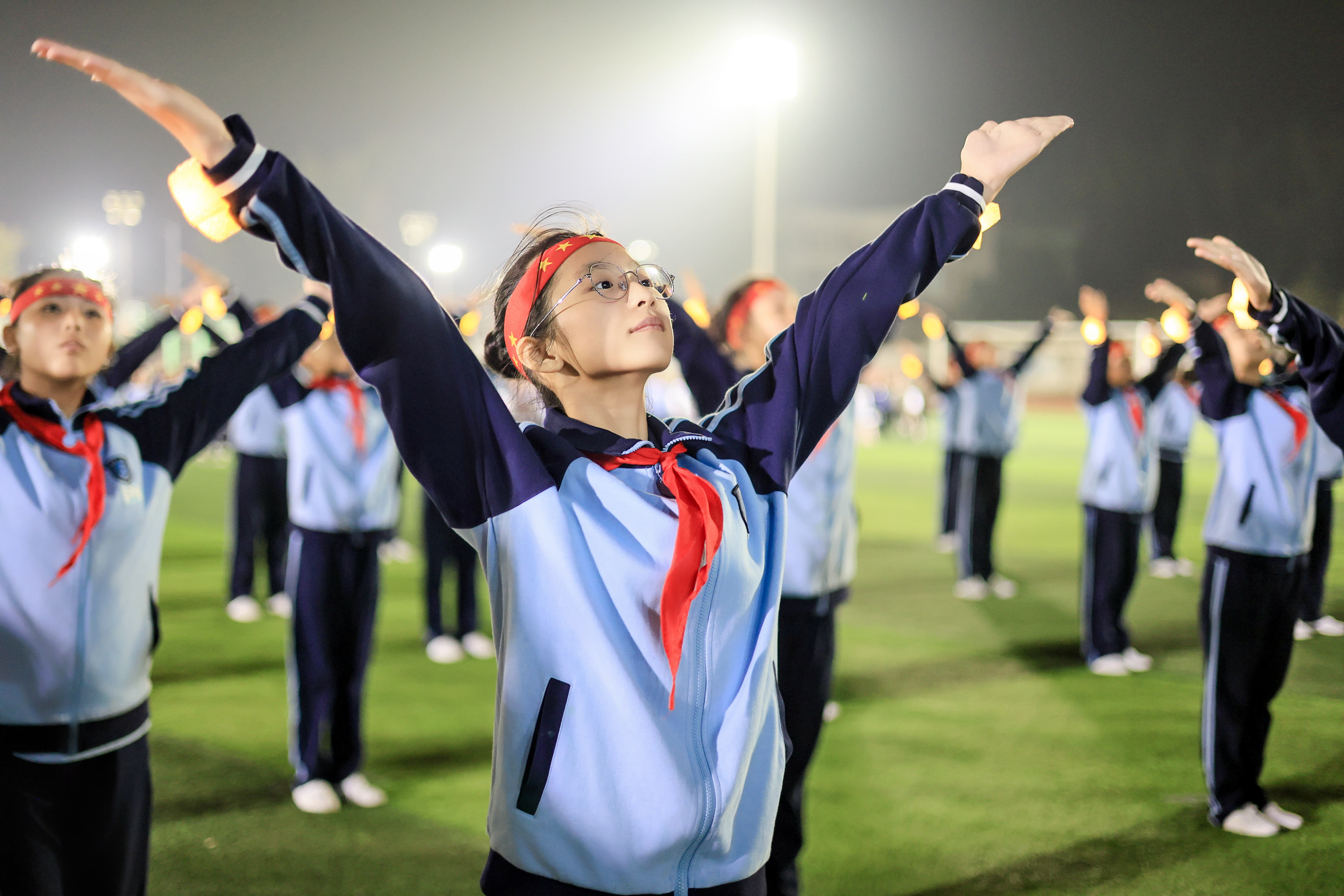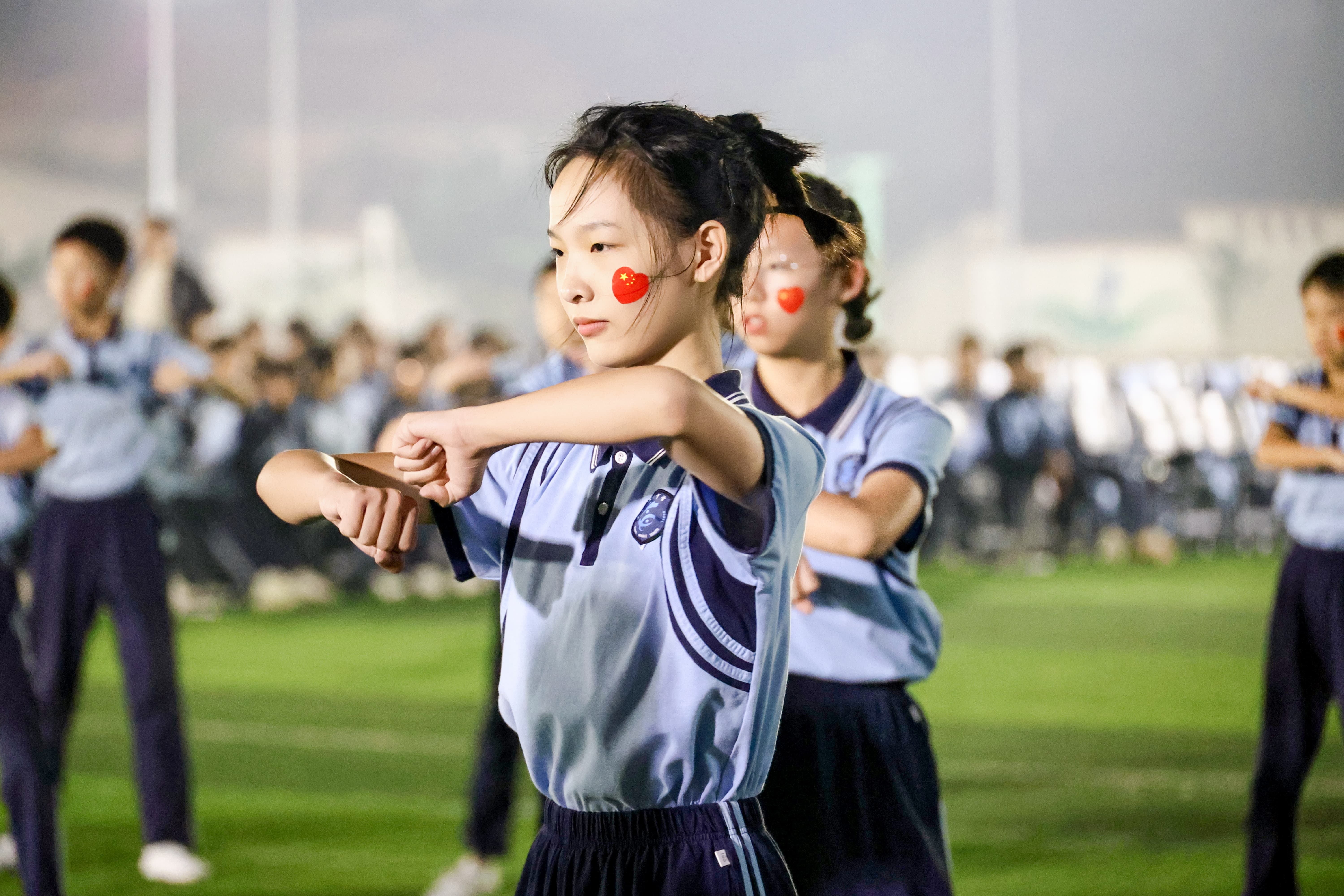 队列展示的余威尚在,广播体操的旋律随即响彻夜空。
