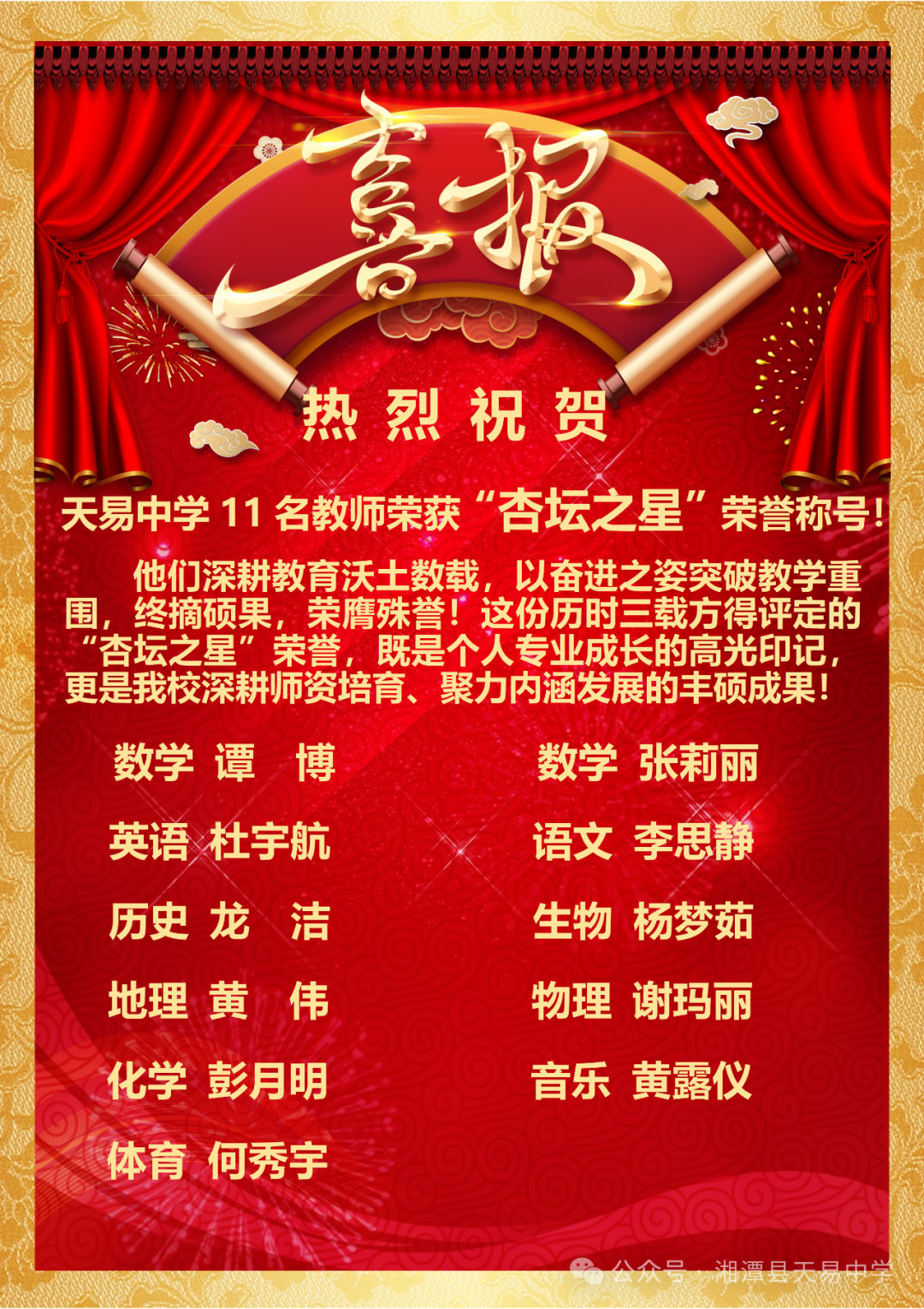 获奖喜讯! 天易中学11位教师荣膺“杏坛之星”荣誉称号!